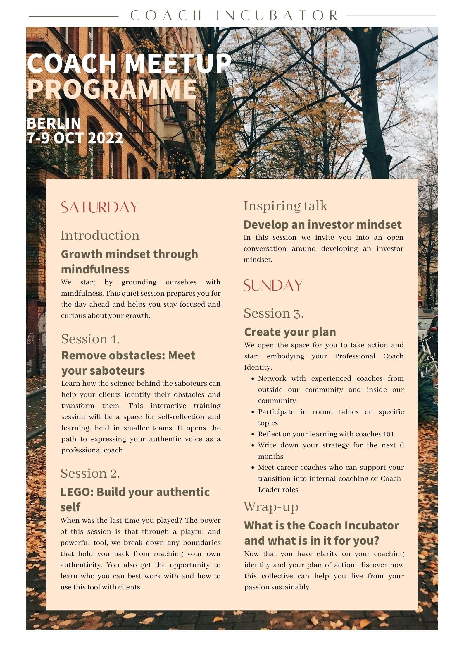 👉🏼 And now, let’s talk about the Berlin 2022 Meetup! We created this initiative so that you can find your authentic coaching voice to build the world you want. Here’s what you’ll gain clarity on: